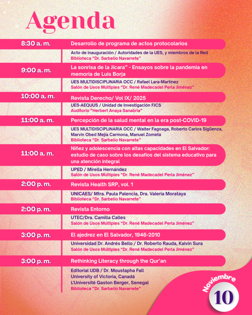 El lunes 10 de noviembre, la feria abrirá con el acto inaugural y una serie de presentaciones editoriales que incluyen La sonrisa de la Jícara, y Percepción de la salud mental en la era post-COVID-19, ambas de la UES Multidisciplinaria OCC; la Revista Derecho Vol. IX (Aeqqus Editorial), el libro Niñez y adolescencia con altas capacidades en El Salvador (UPED), junto con las revistas Health SRP Vol. 1 (UNICAES) y Entorno (UTEC). La jornada cerrará con las presentaciones de El ajedrez en El Salvador, 1946-2010 (UNAB) y Rethinking Literacy through the Qur’an (Editorial UDB).