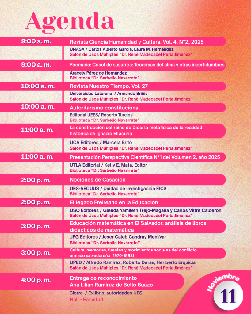 El martes 11 de noviembre, la agenda continuará con la presentación de la Revista Ciencia, Humanidad y Cultura Vol. 4, N.º 2 (UNASA), el poemario Crisol de susurros de Aracely Pérez, la Revista Nuestro Tiempo Vol. 27 (Universidad Luterana), y el libro Autoritarismo constitucional (Editorial UEES). También se presentarán La construcción del reino de Dios (UCA Editores) y la Revista Perspectiva Científica N01 Vol. 2 (UTLA). En la tarde destacan Nociones de Casación (Aeqqus Editorial), El legado freireano en la educación (USO), Educación matemática en El Salvador (UFG Editores) y Cultura, memorias, fuentes y movimientos sociales del conflicto armado salvadoreño (1970–1992) (UPED).