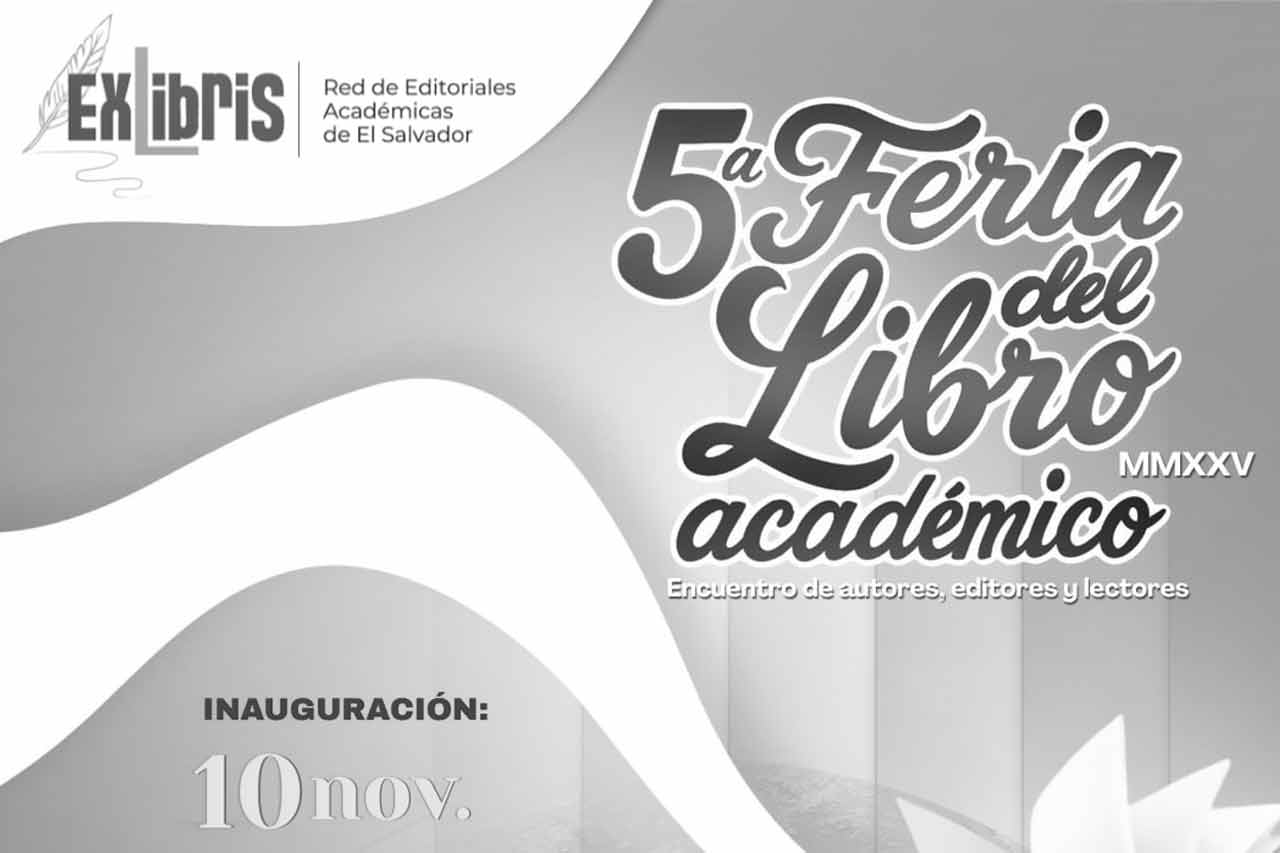 La Red de Editoriales Académicas de El Salvador (ExLibris) se complace en invitar a su 5ª Feria del Libro Académico. El evento se llevará a cabo del 10 al 11 de noviembre de 2025, en el edificio histórico de la Facultad de Jurisprudencia y Ciencias Sociales, de la Universidad de El Salvador.